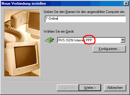 1. Starten Sie die Einrichtung einer neuen Verbindung im DFÜ-Netzwerk. Der Name ist beliebig, können die Verbindung "T-Online" oder so ähnlich nennen