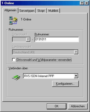 3. Als nächstes überprüfen Sie die Eigenschaften der neuen Verbindung. Klicken Sie die Verbindung mit der rechten Maustaste an und wählen Sie ,,Eigenschaften". Bitte achten Sie darauf, daß "Ortsvorwahl und Wählparameter verwenden" nicht angekreuzt ist, das kann laut der Telekom zu Problemen bei der richtigen Abrechnung führen...