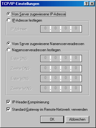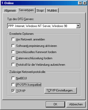 4. Unter ,,Servertypen" sollte ,,PPP: Windows 95, Windows NT 3.51, Internet" und als Protokoll nur TCP/IP angekreuzt sein.