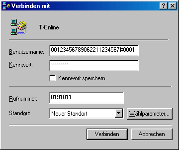 6. Wenn Sie jetzt die neue Verbindung starten, werden Sie aufgefordert, Benutzernamen und Kennwort einzugeben. Diese Daten entnehmen Sie dem Einschreiben mit Ihrer T-Online-Anmeldebestätigung. Geben Sie Anschlußkennung, T-Online-Nummer und Mitbenutzemummer hintereinander ohne Leerstellen in das Feld ,,Benutzername" ein. Ihre Mitbenutzernummer ist normalerweise 0001. Ist Ihre T-Online-Nummer kürzer als 12 Stellen, müssen Sie zwischen dieser Nummer und der Mitbenutzemummer eine Raute # eingeben.